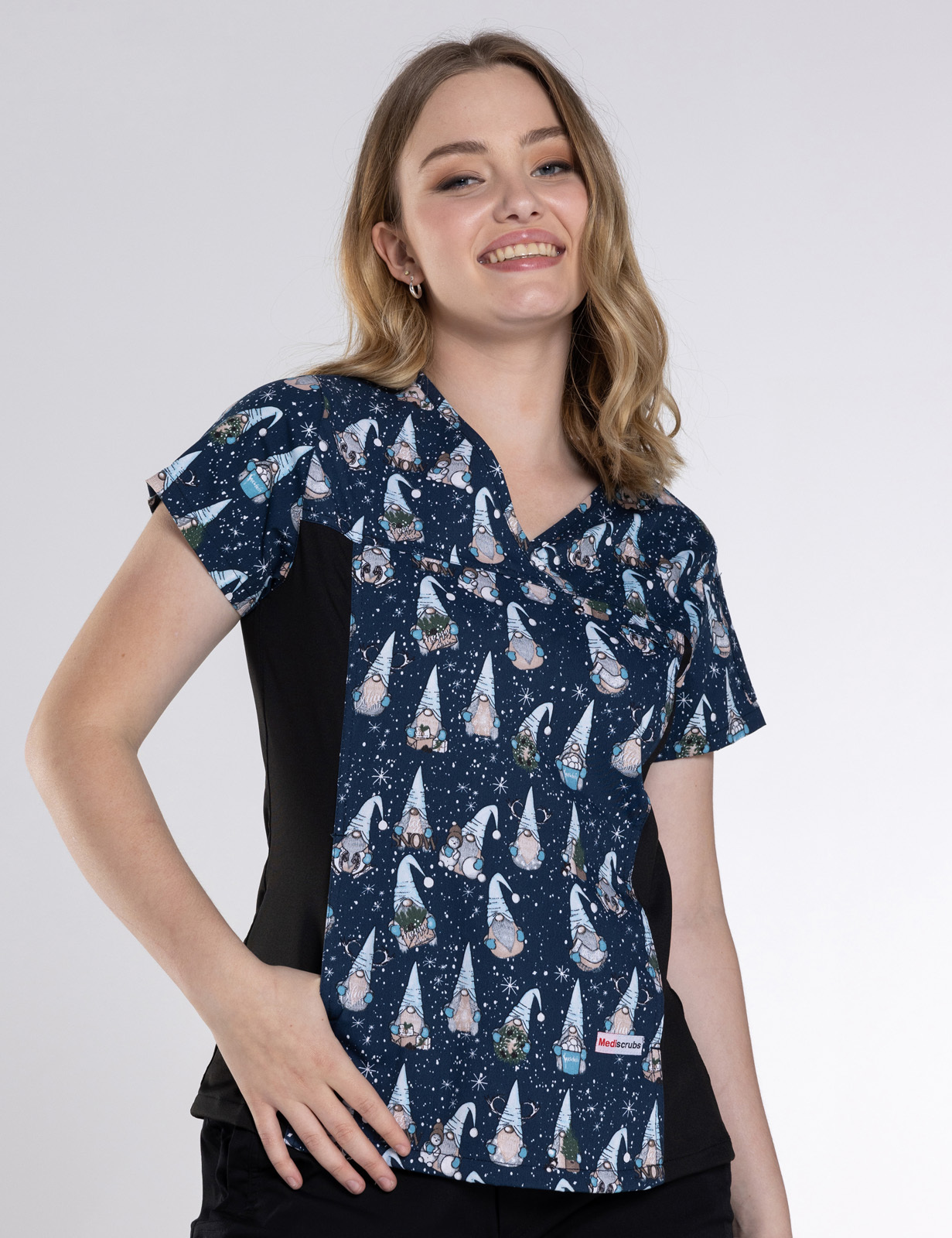 North Pole Gnomes, is a fashion forward and stylish Christmas scrub top. This will surely be a favourite this year. The North Pole Gnomes showcases cute Gnomes all holding decorations and presents, for true believers of Christmas this is the scrub top is for you.