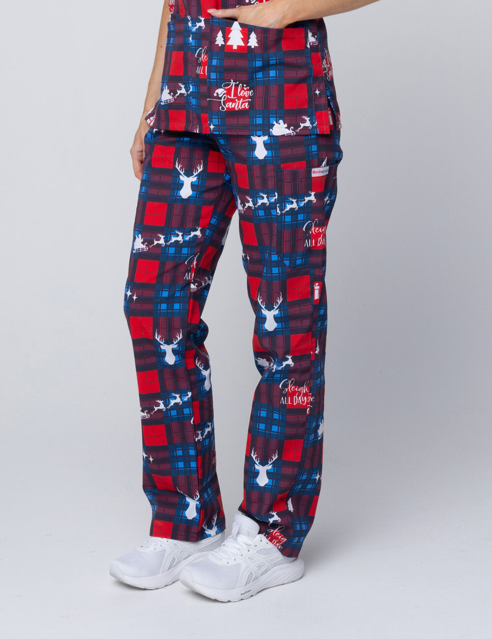 Celebrate the season with our I Love Santa scrubs — a joyful blend of classic tartan and playful holiday spirit. Featuring a bold red-and-blue plaid background, this design is sprinkled with crisp white festive icons like Santa’s sleigh, reindeer, twinkling trees, and wrapped gifts. Cheerful phrases like “I ♥ Santa” and “Sleigh All Day” add a fun twist that’s sure to brighten every shift.