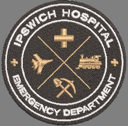 • RIGHT CHEST / IPSWICH HOSPITAL EMERGENCY DEPARTMENT LOGO with (Name) TEXT and (Title) TEXT