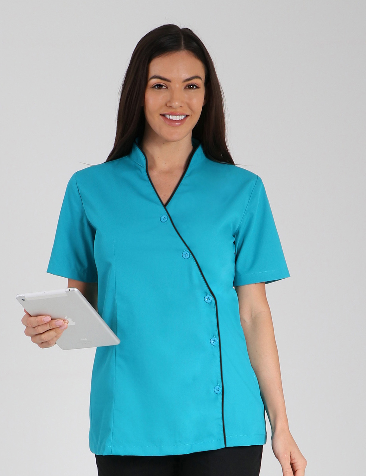 If you’???re looking for ladylike refinement and classic styling, then the Jessie tunic scrub top with contrasting trim colour is the perfect addition to your work wardrobe. With the use of contrasting trim colour, you can easily identify job roles or departments whilst maintaining some kind of consistency with your work uniforms. Easily paired with cargo or utility scrub pants for a flattering everyday look. The Jessie tunic with contrasting trim features alluring details and ultra-soft fabrication. The button-down crossover neckline and flowy silhouette make it easy to dress up or down.