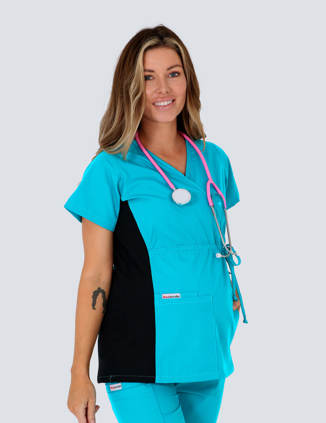 Two-way stretch fabric and feminine cross-over tie front, Mediscrubs maternity scrub top the flexibility to move and grow with you. The addition of knit black side panels allows freedom of movement as you grow. This maternity style is designed to support and flatter using your current size.