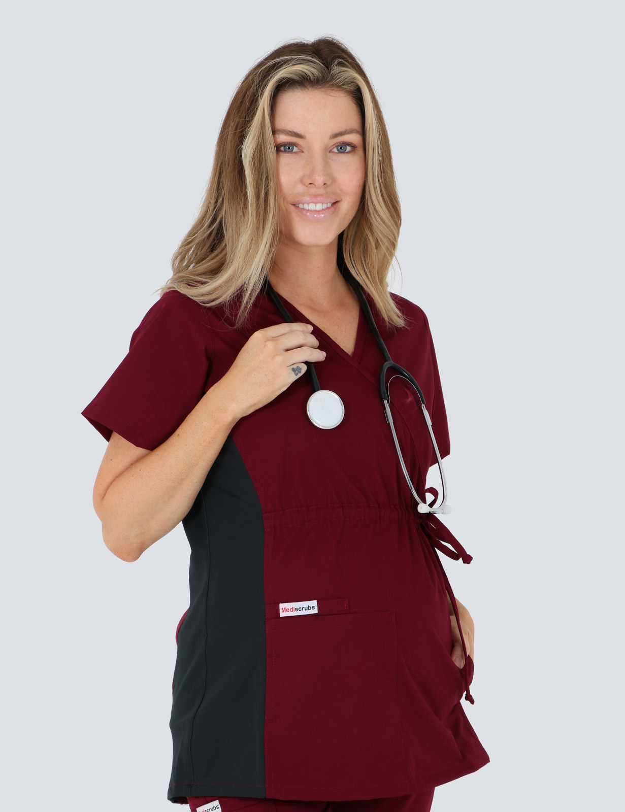 Maternity Scrub Top With Spandex Panel - Burgundy - Medium