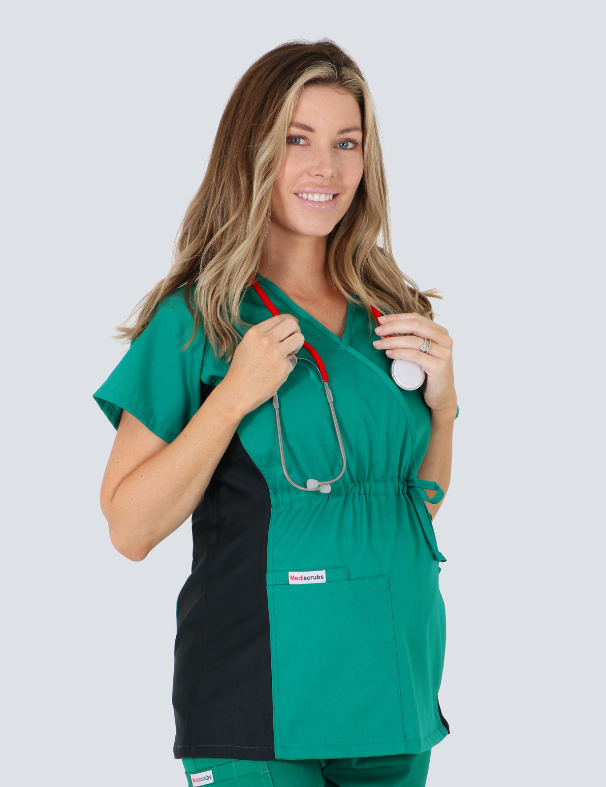Two-way stretch fabric and feminine cross-over tie front, Mediscrubs maternity scrub top the flexibility to move and grow with you. The addition of knit black side panels allows freedom of movement as you grow. This maternity style is designed to support and flatter using your current size.