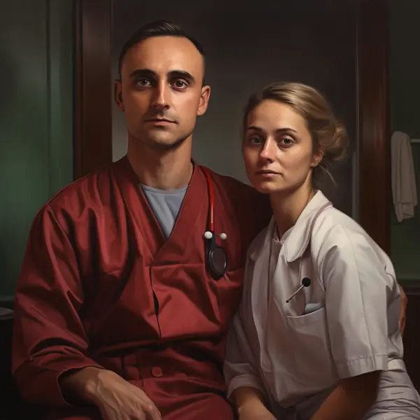 2. AI-Generated Image of Nurses: The AI-generated image of two nurses presents a young woman in a neutral beige coloured uniform, looking rather sombre and a male nurse in Burgundy coloured scrubs with a look of determination. While nursing is a predominantly female-dominated profession, it is crucial to avoid reinforcing gender stereotypes. The AI-generated image also did well not portraying nurses solely as young women, and neglecting the diverse range of individuals who contribute to the nursing profession. Emphasising the importance of showcasing male nurses, older professionals, and individuals from different cultural backgrounds is essential for fostering inclusivity.