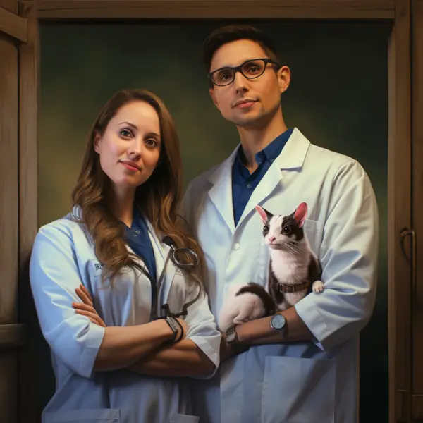3. AI-Generated Image of Two Veterinarians: The AI-generated image of veterinarians features a young-looking male veterinarian holding a unique-looking cat, while the female veterinarian is young and attractive. Both vets look professional and are easily recognisable as veterinarians. Although this image captures the essence of animal care, it overlooks the diverse roles and responsibilities that veterinarians undertake. Veterinarians work with a variety of animals, including livestock, exotic species, and wildlife. Highlighting this diversity in AI-generated images would contribute to a more comprehensive representation of the veterinary profession.