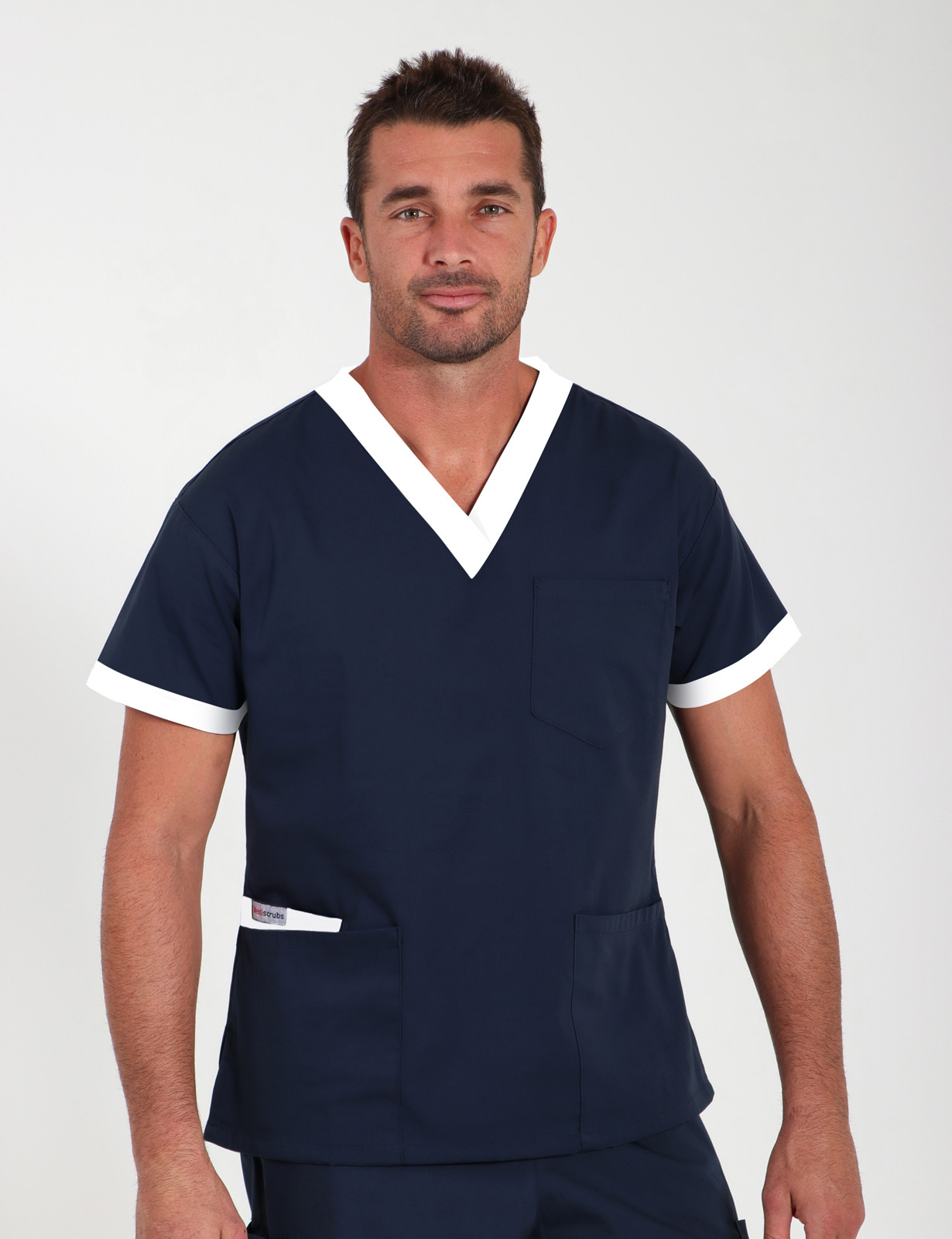 This 4-pocket scrub top showcases contrasting colours around the V neckline and an insert inside one front pocket, adding an element of intrigue and individuality to its practical design.
