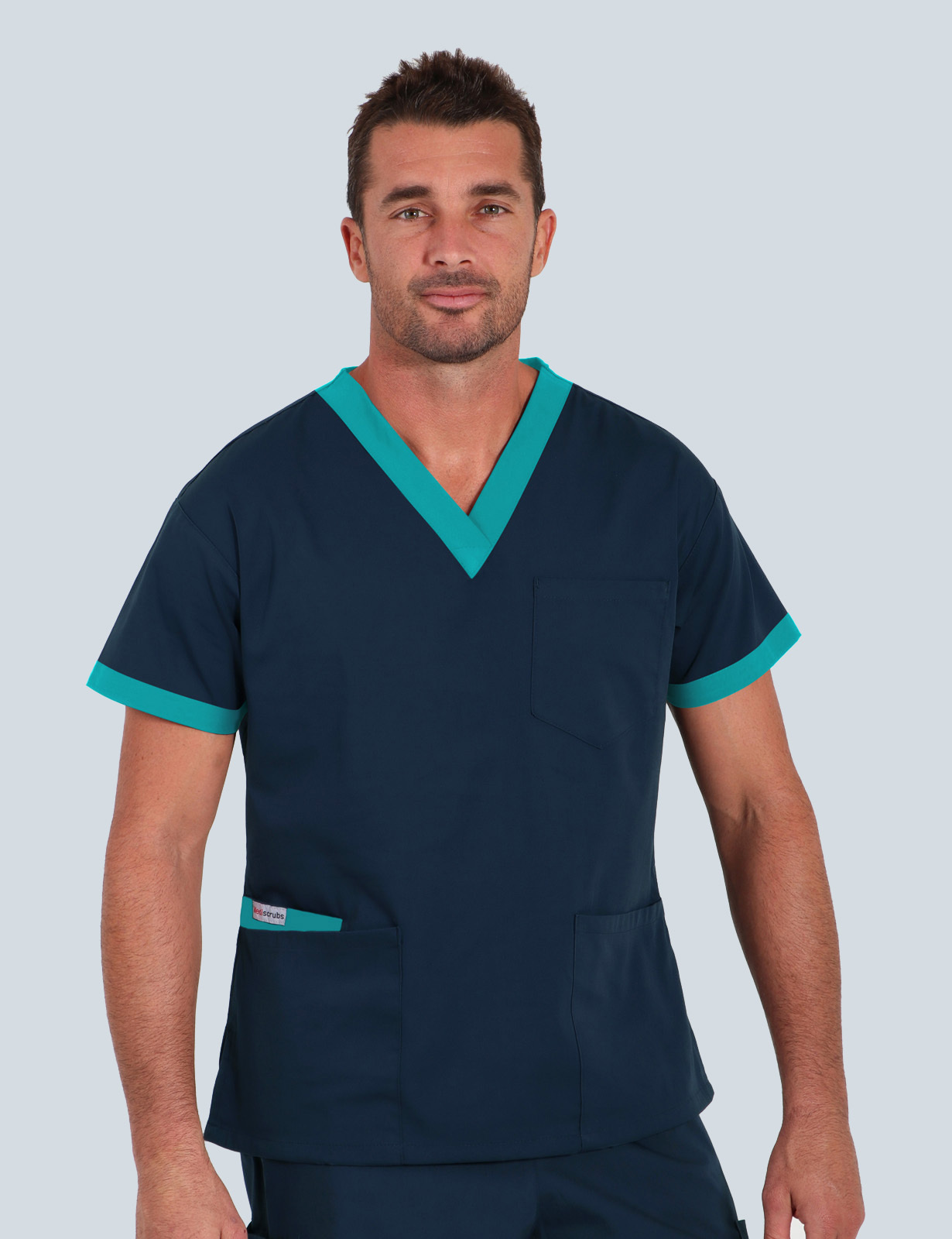 Men's Contrast Trim 4 Pocket Top - Navy with Teal Trim - X Small