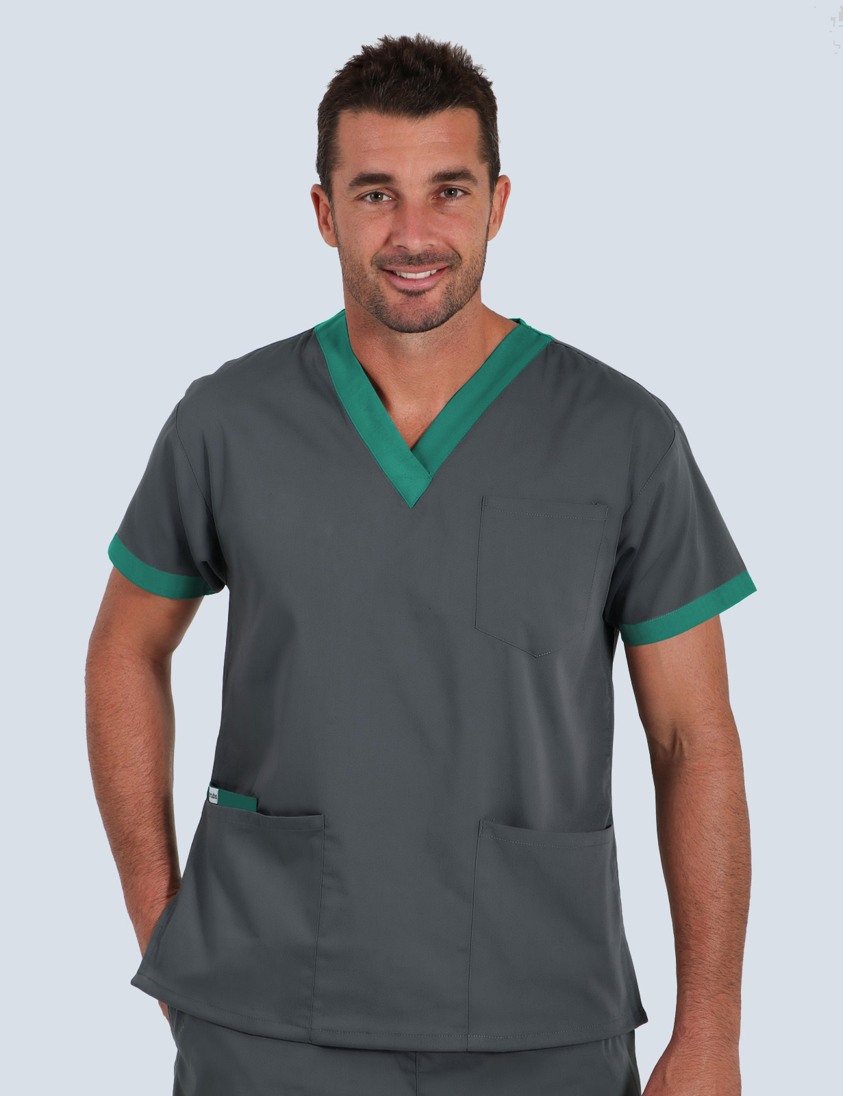 This 4-pocket scrub top showcases contrasting colours around the V neckline and an insert inside one front pocket, adding an element of intrigue and individuality to its practical design.