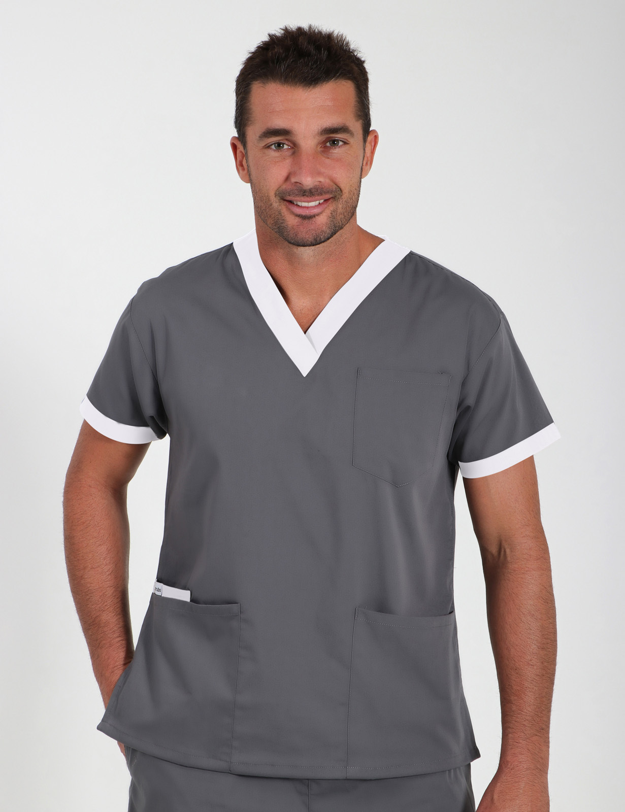 This 4-pocket scrub top showcases contrasting colours around the V neckline and an insert inside one front pocket, adding an element of intrigue and individuality to its practical design.
