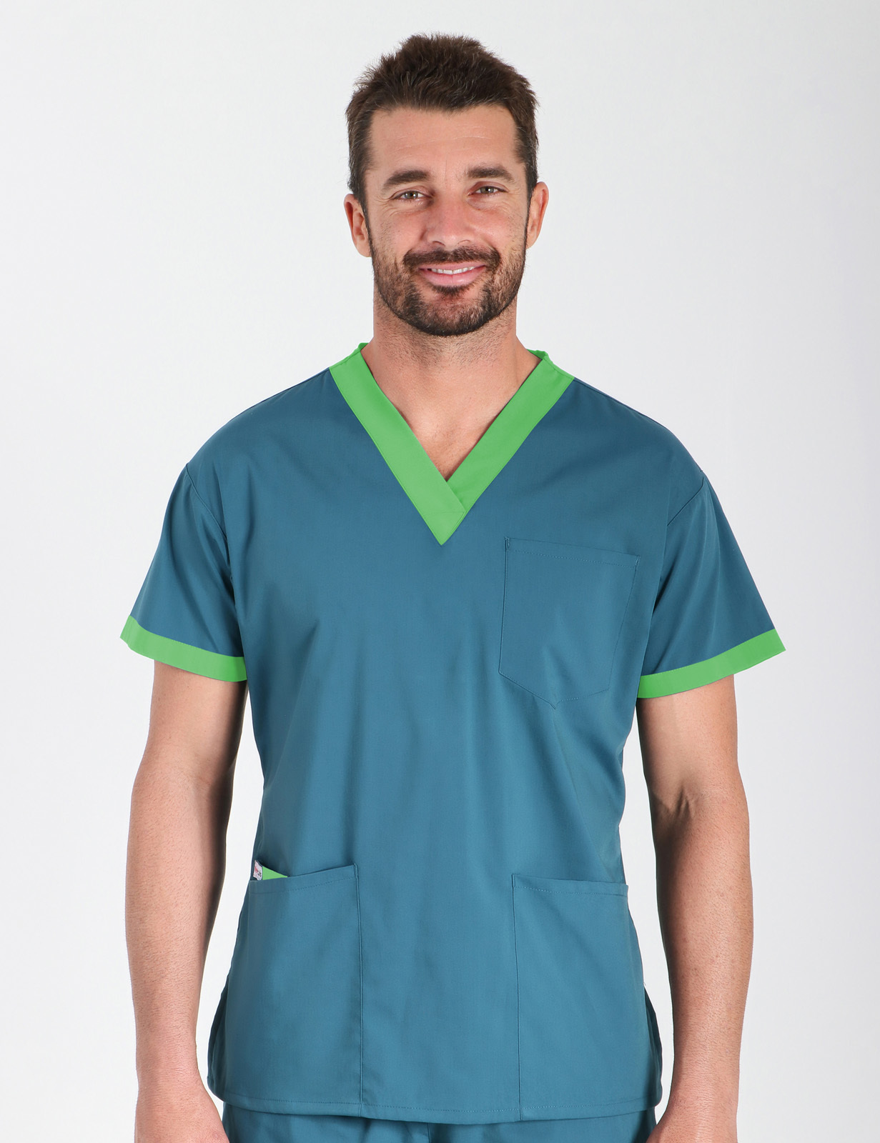 Men's Contrast Trim 4 Pocket Top - Caribbean with Lime Green Trim - XX Small