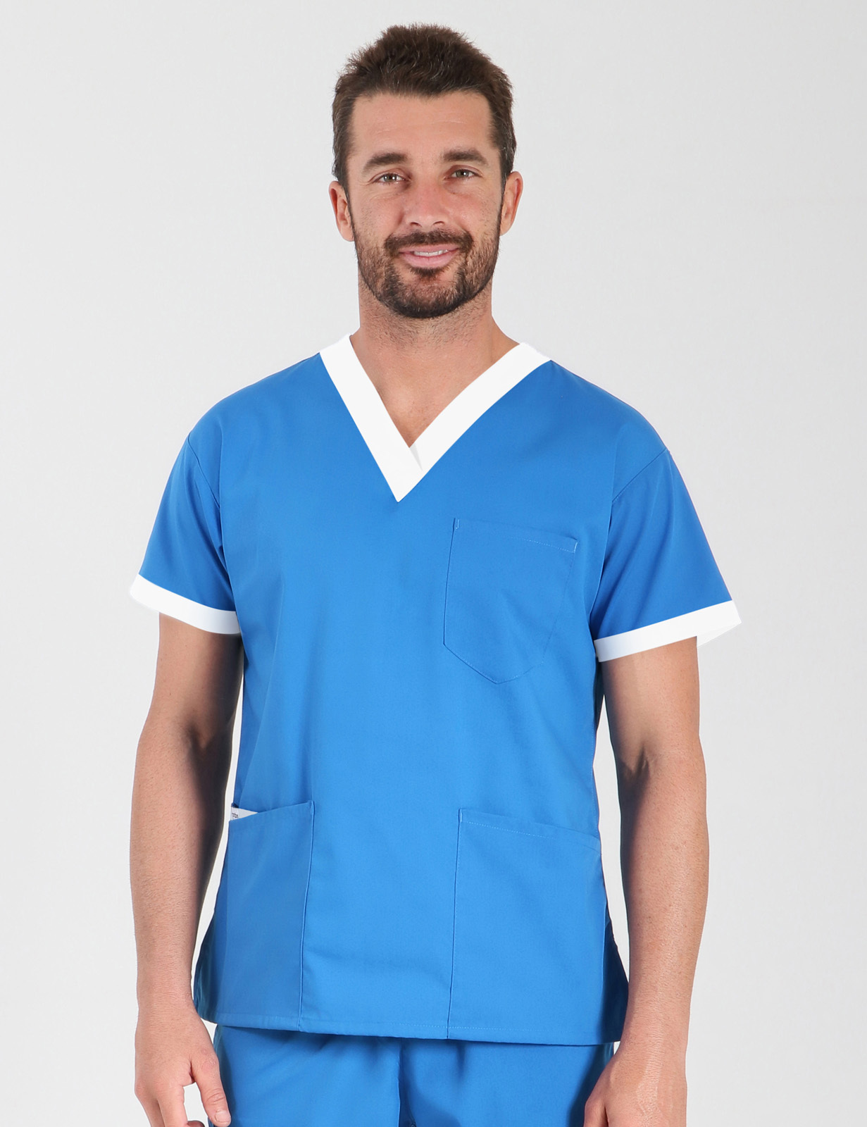 This 4-pocket scrub top showcases contrasting colours around the V neckline and an insert inside one front pocket, adding an element of intrigue and individuality to its practical design.