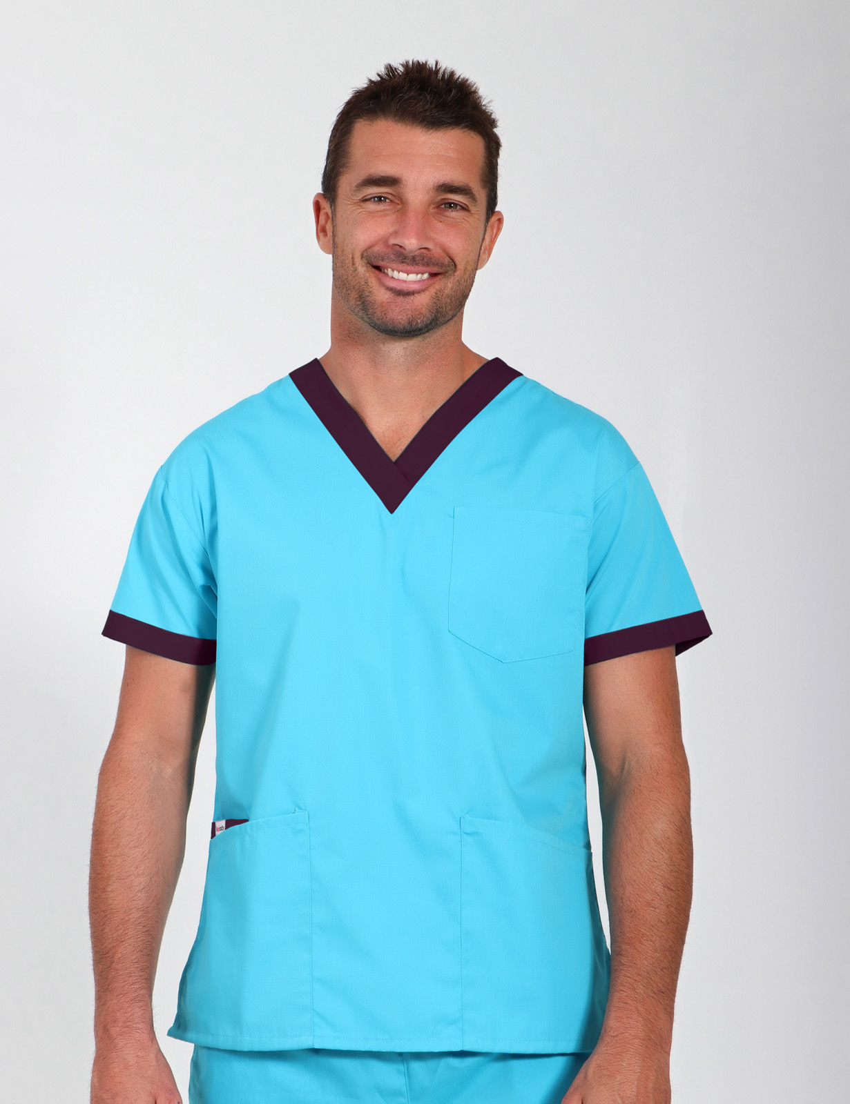 Men's Contrast Trim 4 Pocket Top - Aqua with Aubergine Trim - 4X Large