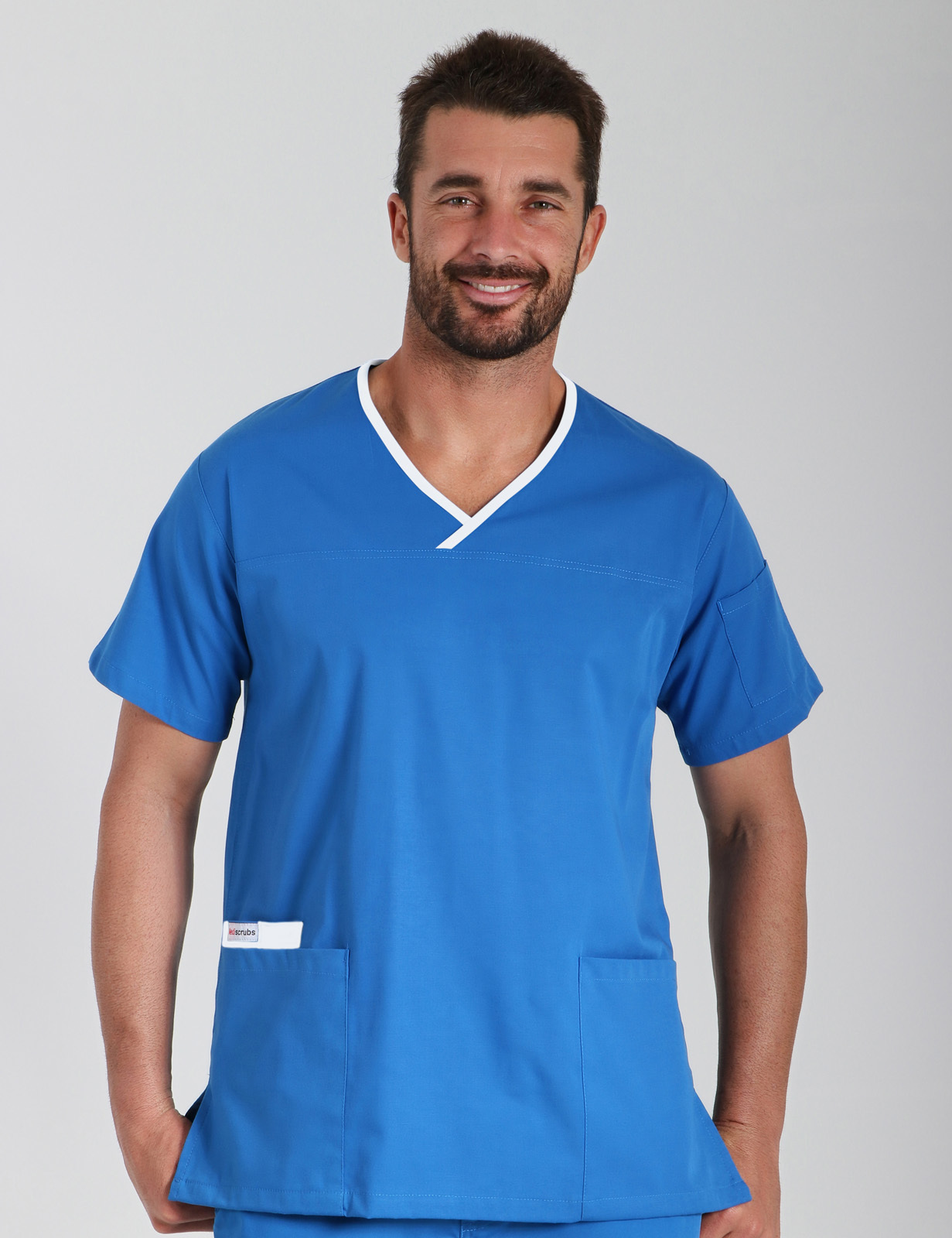 The Men's fit scrub top with contrast trim collar is a tailored made scrub top just for men.