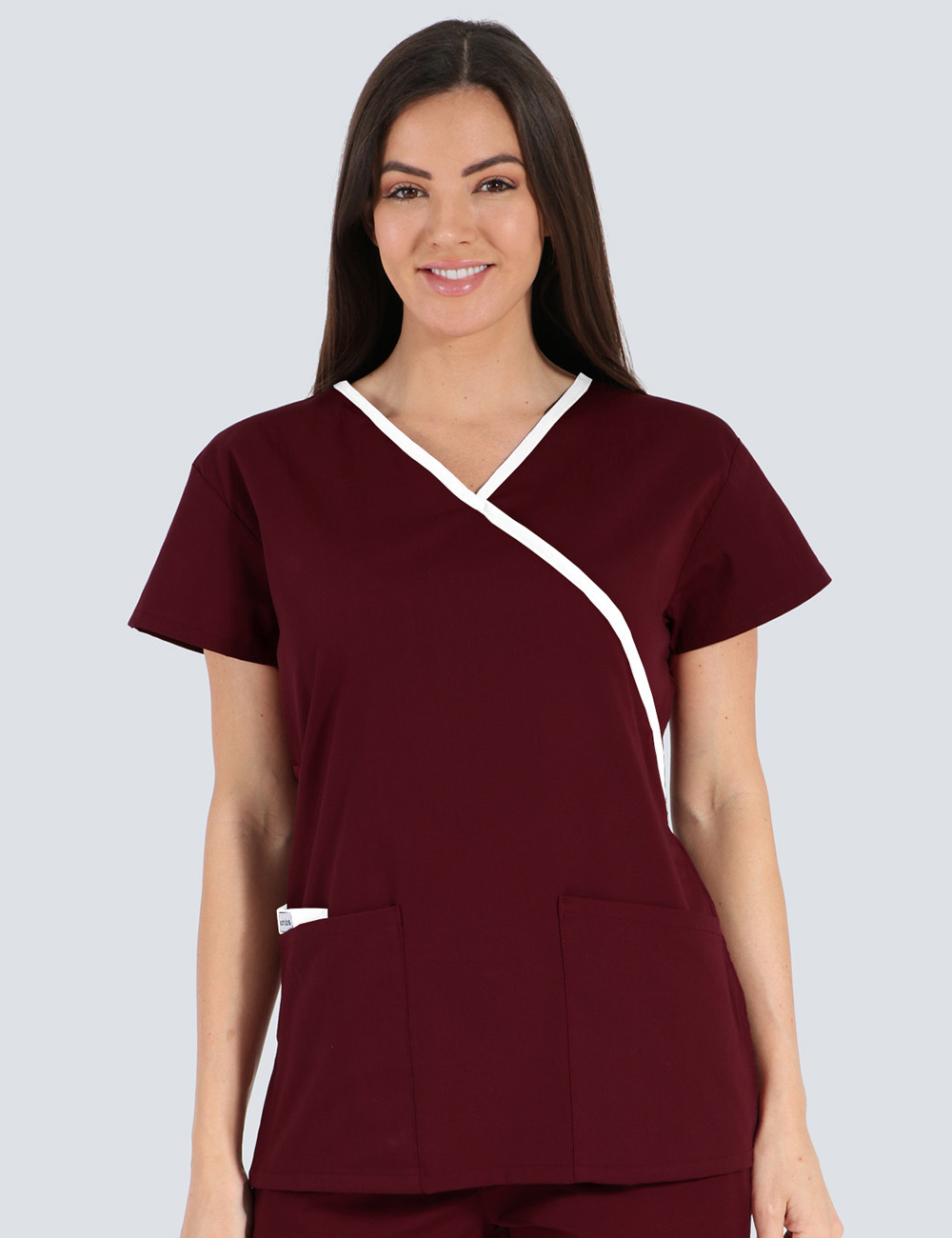 This Mockwrap scrub top features contrasting colour around the V neckline and on an insert inside one front pocket to add interest and personality to this functional design.