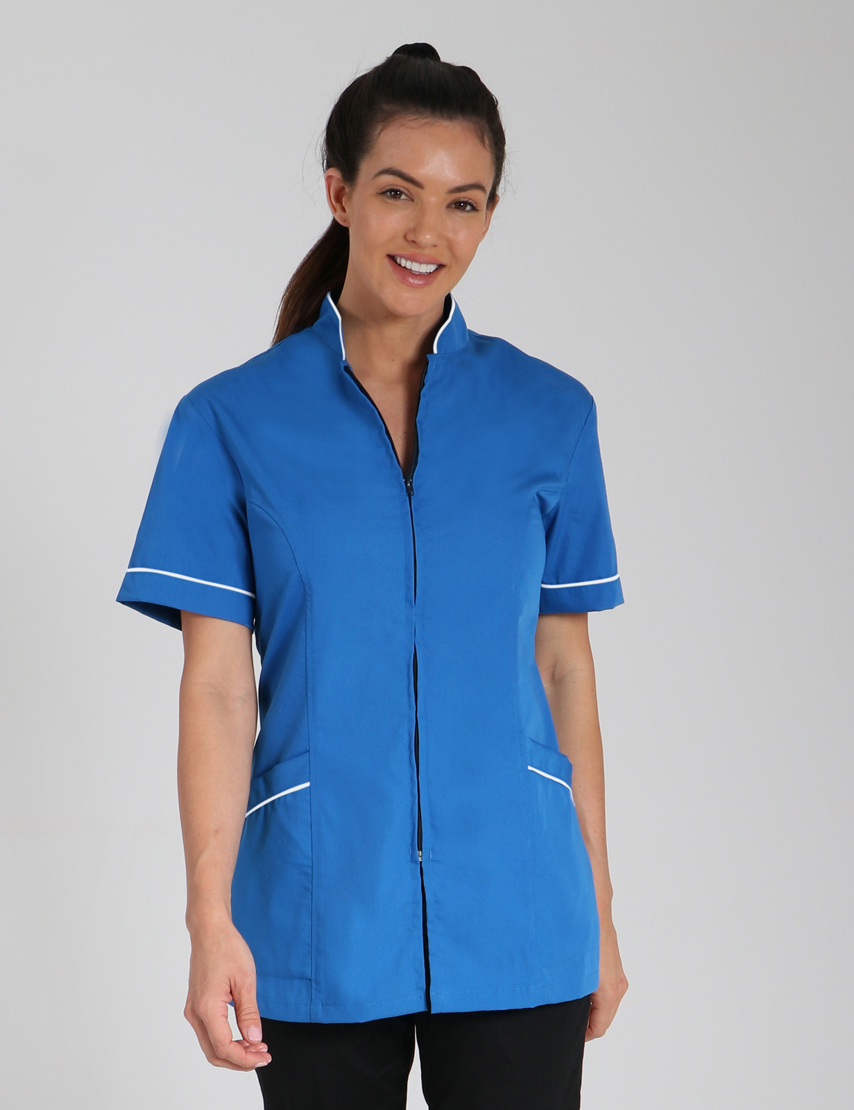 From work to home, the Nellie tunic with contrasting trim is a professional work uniform that means business.