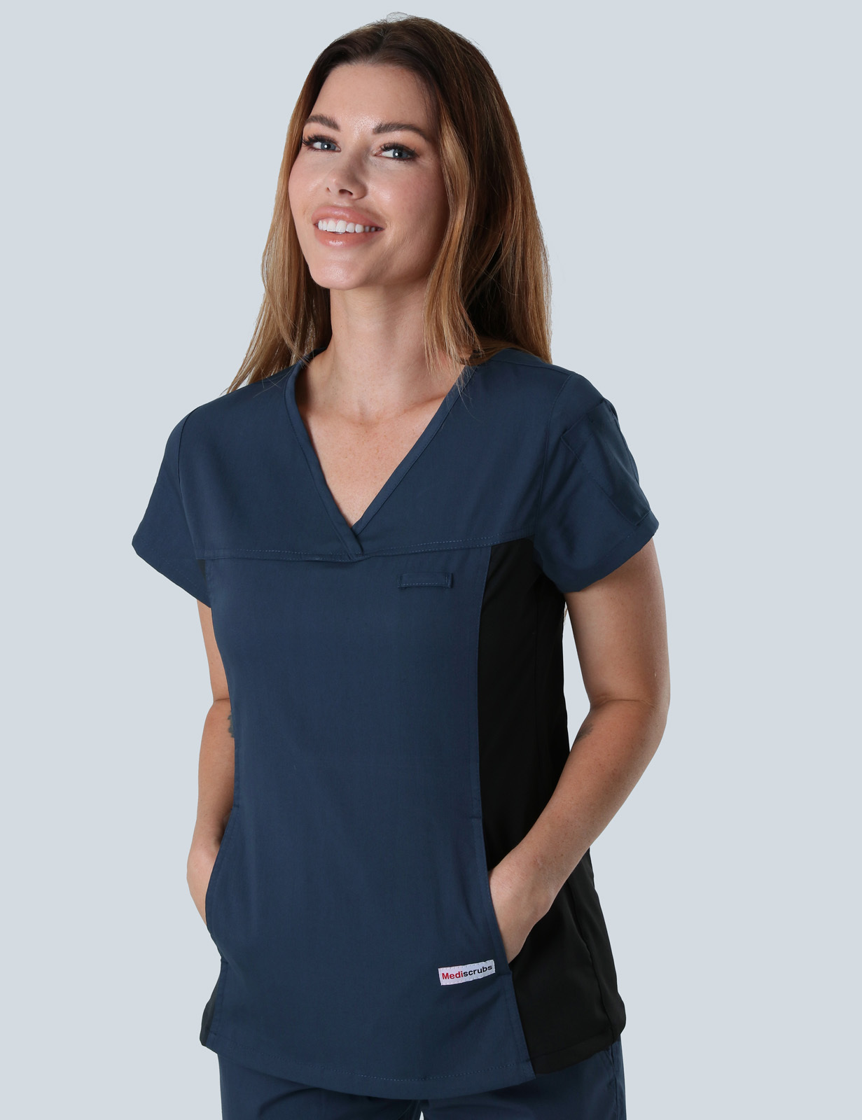 • TOP - NAVY WOMEN'S FIT WITH BLACK SPANDEX PANEL  SCRUB TOP