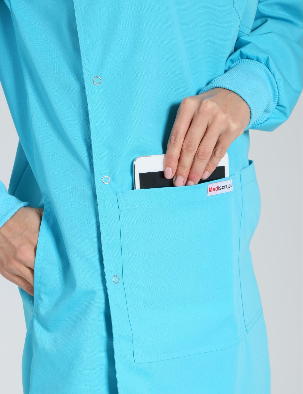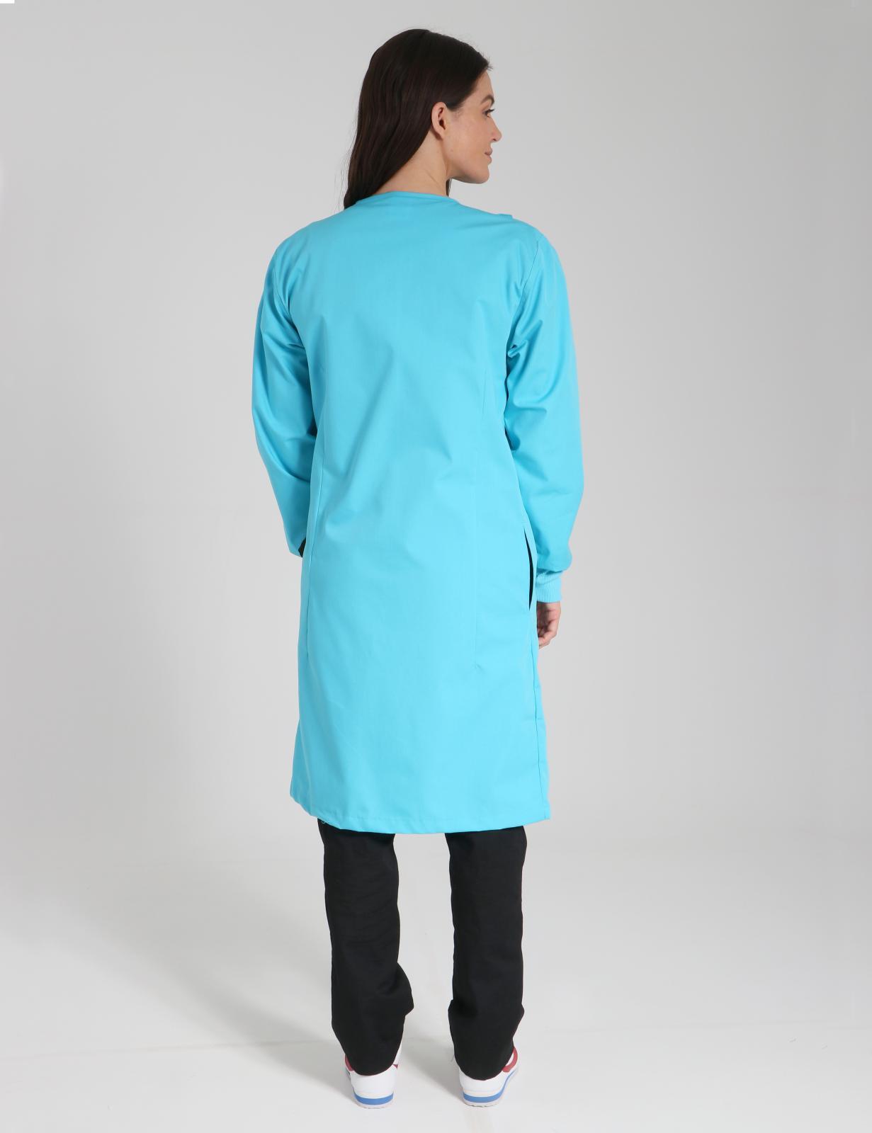 This customisable 'Side-opening lab coat has various clever design features. Knitted cuffs offer protection. Two lower extra patch pockets provide easy storage and a left chest pocket allows for easy access. The garment is protected with an antimicrobial liquid repellent finish.