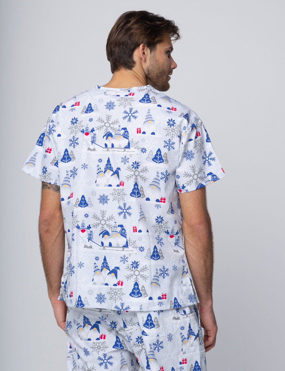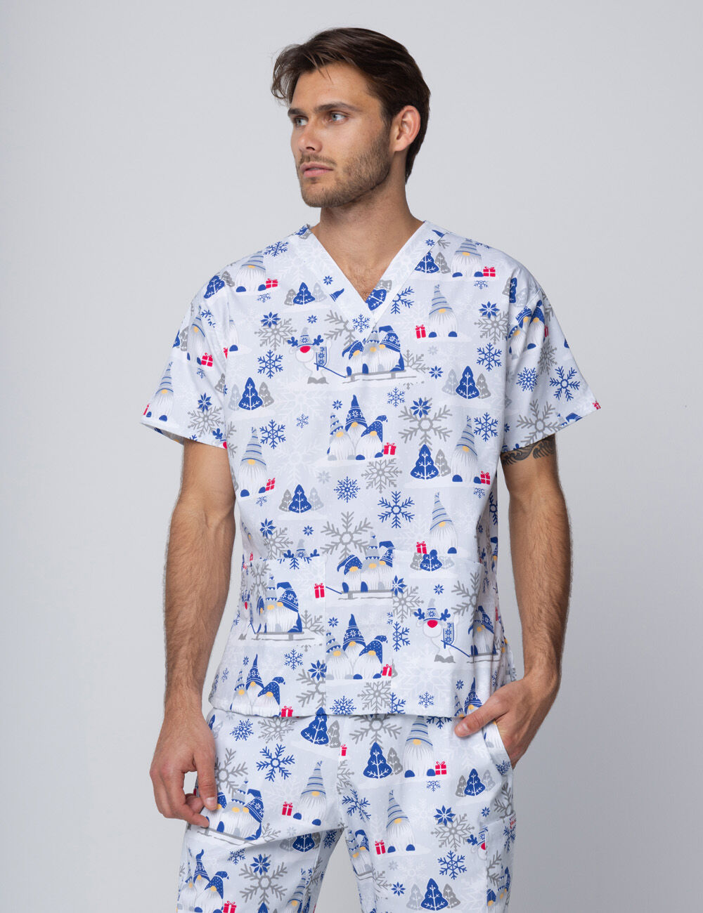 Add a touch of holiday magic to your workday with our Dashing Through the Gnomes scrubs. This cheerful design features playful gnomes in cozy winter hats, surrounded by snowflakes, twinkling trees, and pops of red gift boxes — all set against a cool grey background with icy and midnight blue accents.