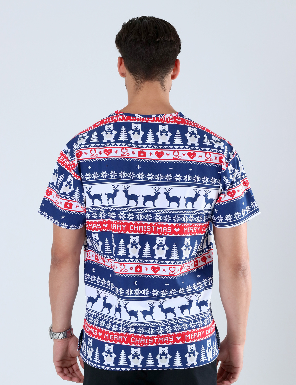 This year, we’ve elevated the classic ugly sweater with a sophisticated color palette of midnight blue, white, silver, and red, making it the perfect Christmas scrub print top. Be the talk of the town with this festive design that pairs beautifully with navy scrub pants. Adorned with red love hearts, stethoscopes, and Merry Christmas wishes, this scrub top is designed to spread holiday cheer throughout the festive season. It’s one of our favorites this year, and we hope it becomes yours too! Celebrate in style and bring a touch of class to your holiday wardrobe with this unique and joyful scrub top.