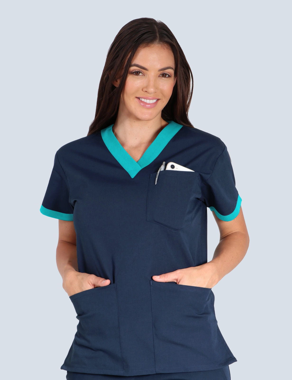 Women's Contrast Trim 4 Pocket Top - Navy with Teal Trim - X Small