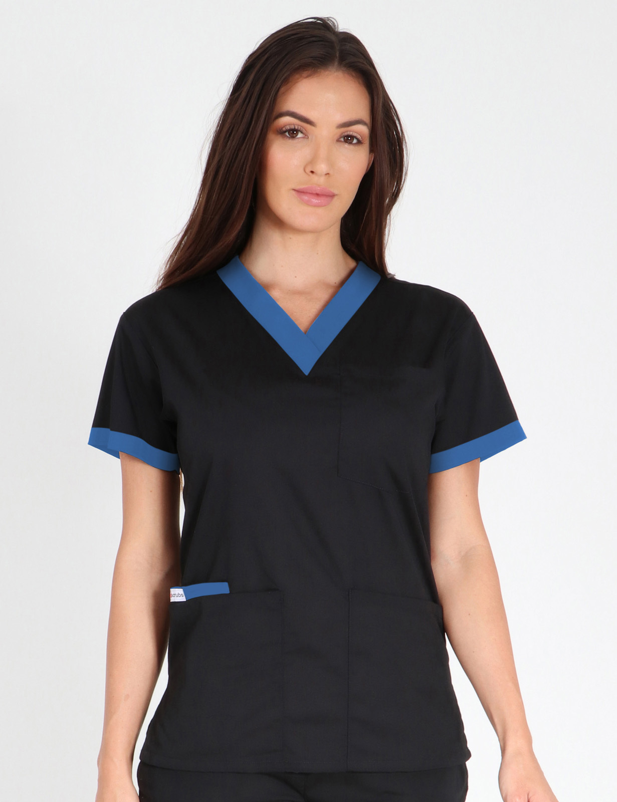 This 4-pocket scrub top showcases contrasting colours around the V neckline and an insert inside one front pocket, adding an element of intrigue and individuality to its practical design.