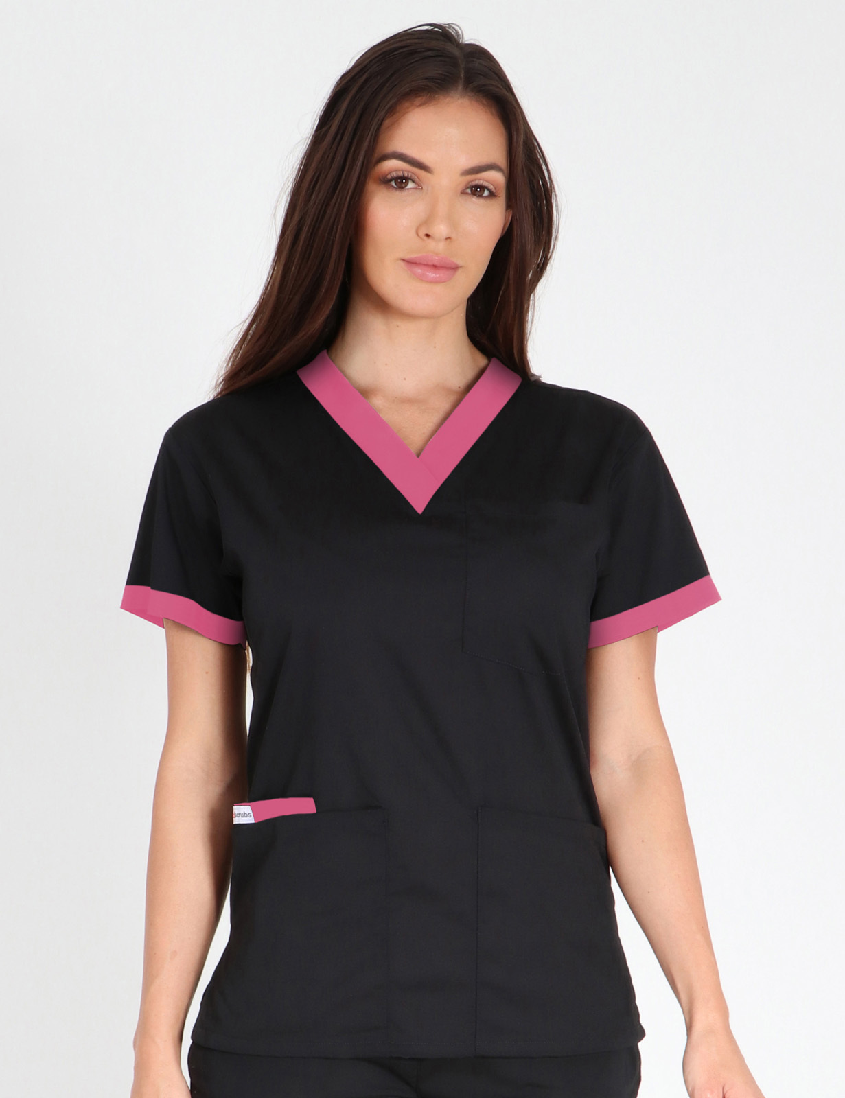 This 4-pocket scrub top showcases contrasting colours around the V neckline and an insert inside one front pocket, adding an element of intrigue and individuality to its practical design.