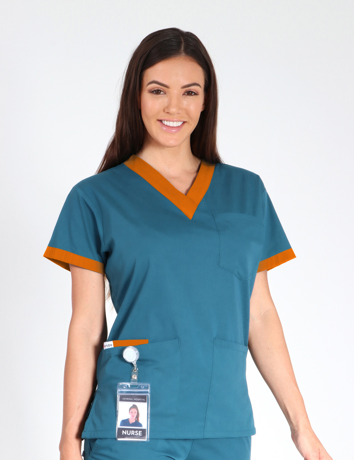 This 4-pocket scrub top showcases contrasting colours around the V neckline and an insert inside one front pocket, adding an element of intrigue and individuality to its practical design.
