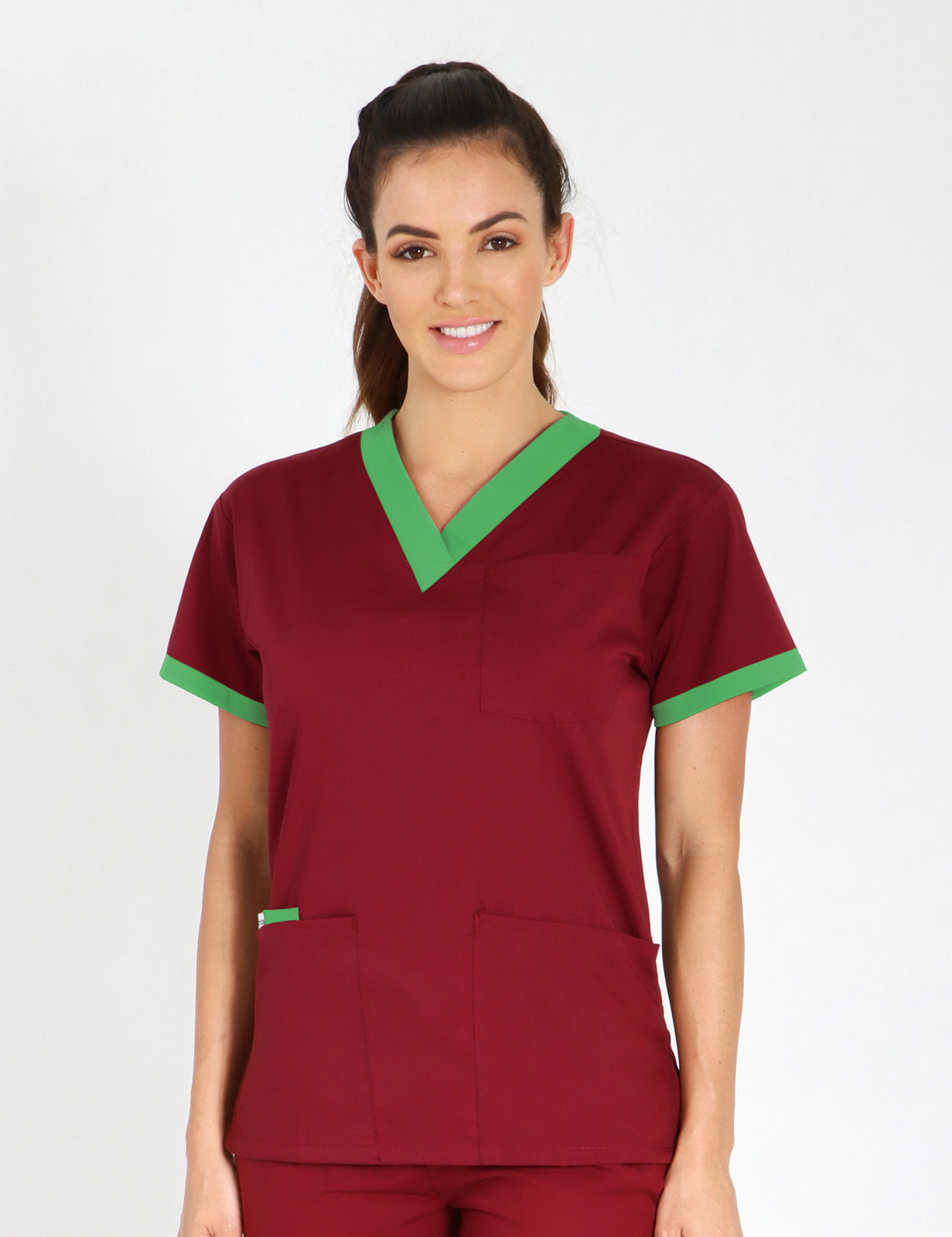 This 4-pocket scrub top showcases contrasting colours around the V neckline and an insert inside one front pocket, adding an element of intrigue and individuality to its practical design.
