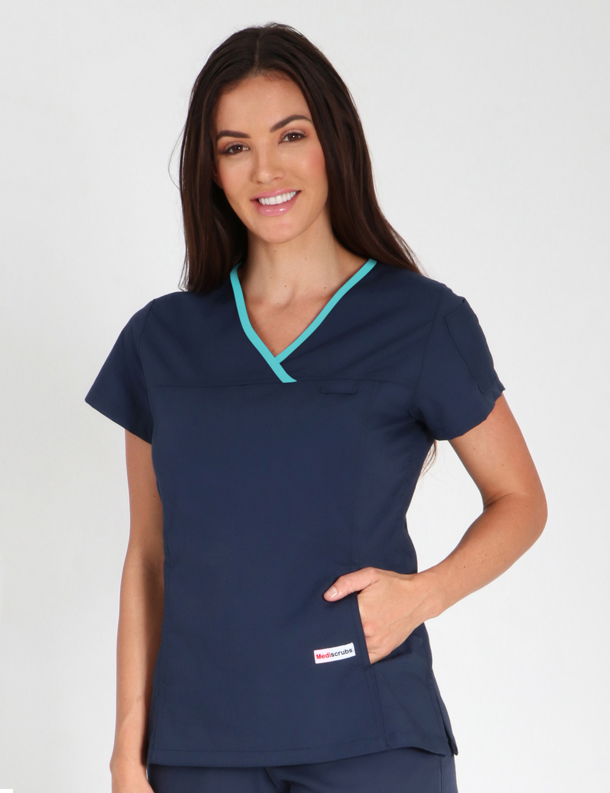 Women's Fit Solid Scrub Top - Navy with Aqua Trim - X Small