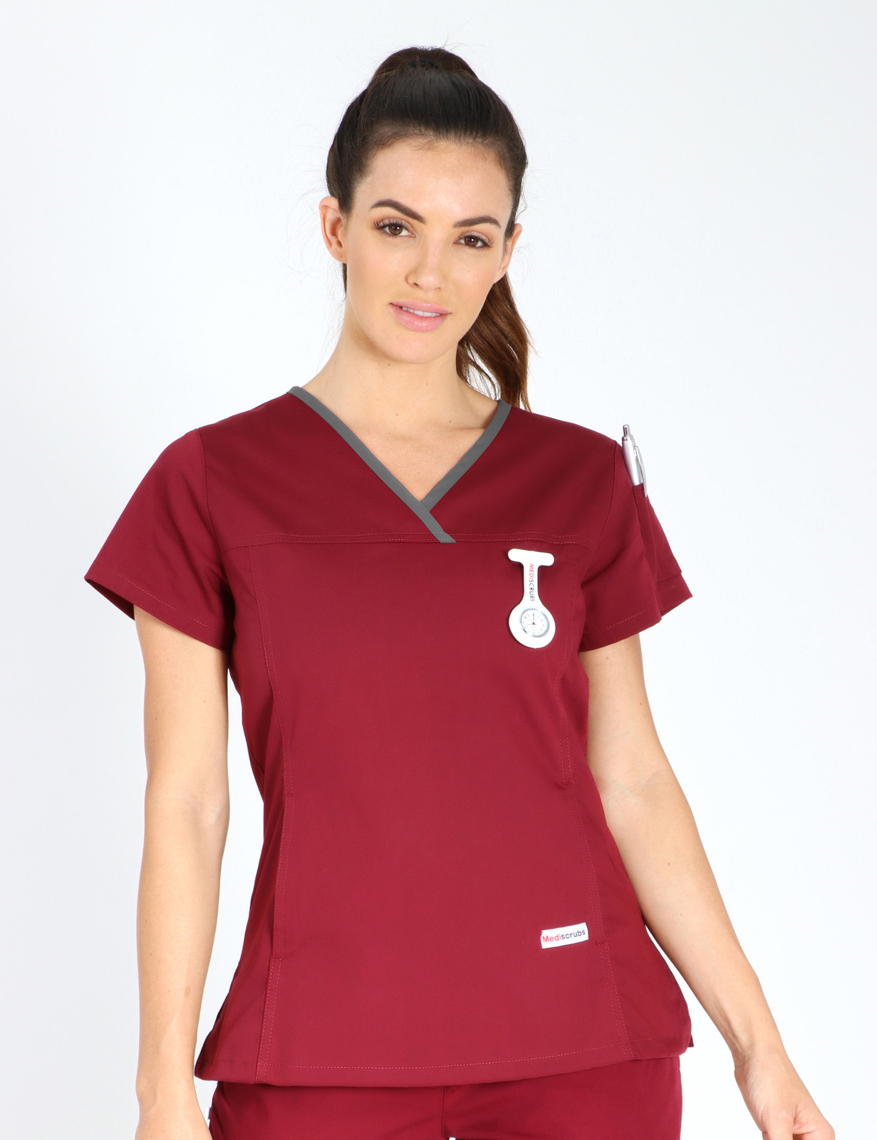 Women's Fit Solid Scrub Top - Burgundy with Steel Grey Trim - Medium