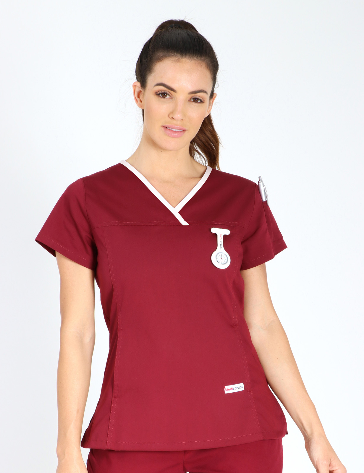 Women's Fit Solid Scrub Top - Burgundy with White Trim - 3X Large