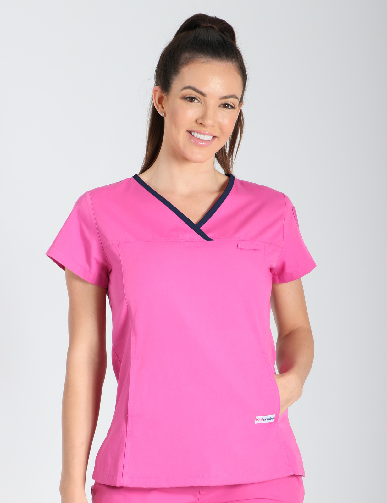 Women's Fit Solid Scrub Top - Pink with Navy Trim - Medium