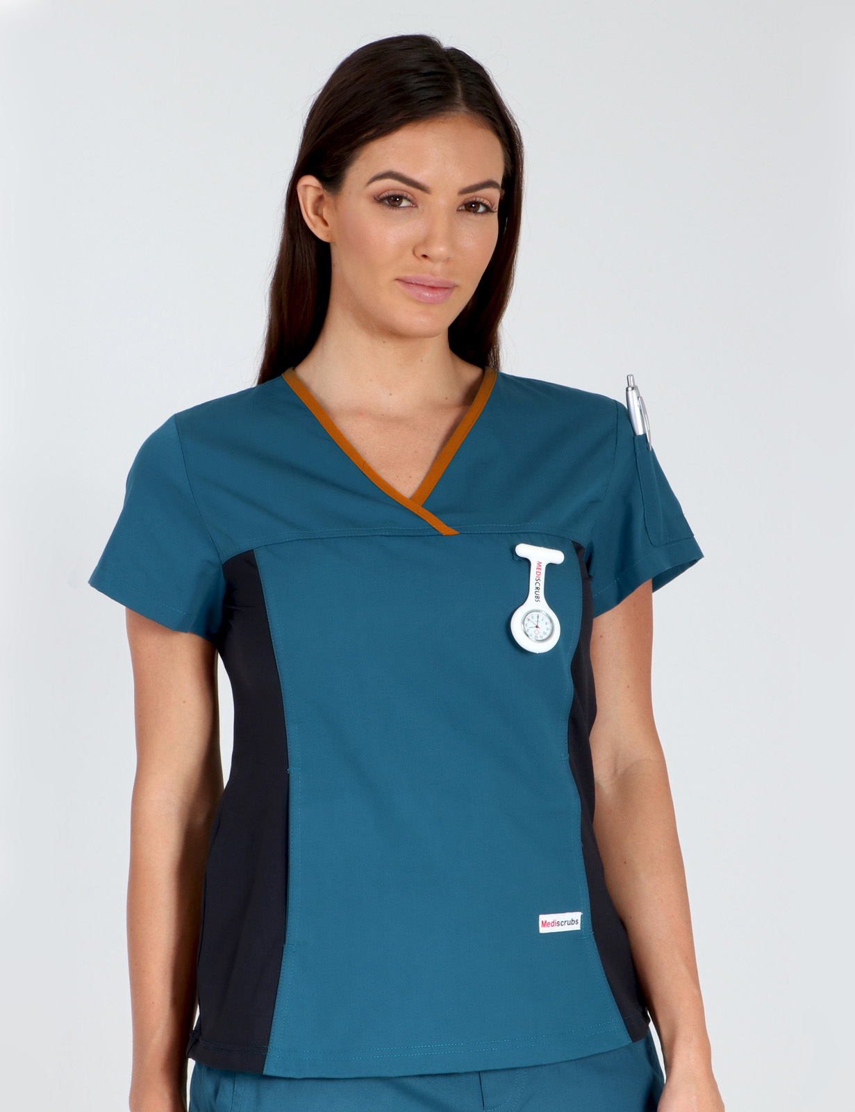Check out this professional-looking women's scrub top with black spandex side panel. Designed for all-day comfort, this women's scrub top features a contrasting trim colour collar. Sporting black spandex side panels on either side to accentuate your feminine curves, this highly sought-after scrub top adapts easily to any body shape and is a versatile addition to any healthcare professional's work wardrobe.