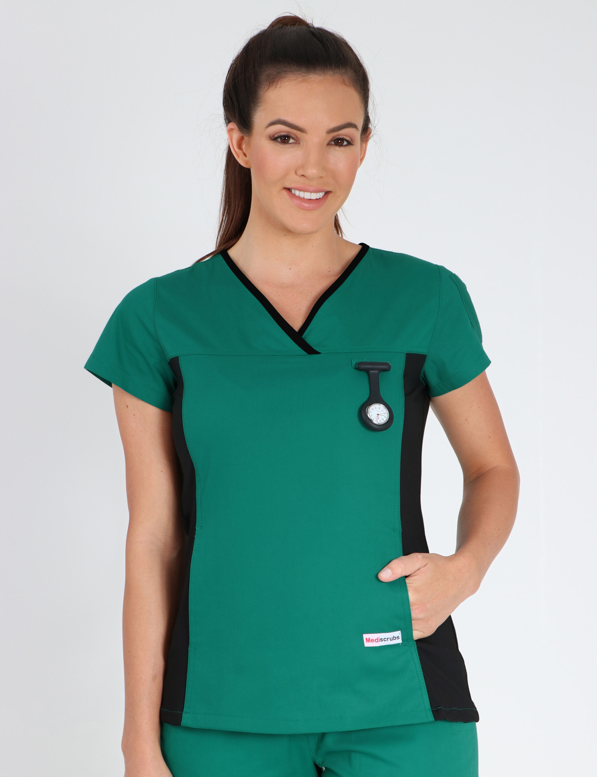 Check out this professional-looking women's scrub top with black spandex side panel. Designed for all-day comfort, this women's scrub top features a contrasting trim colour collar. Sporting black spandex side panels on either side to accentuate your feminine curves, this highly sought-after scrub top adapts easily to any body shape and is a versatile addition to any healthcare professional's work wardrobe.
