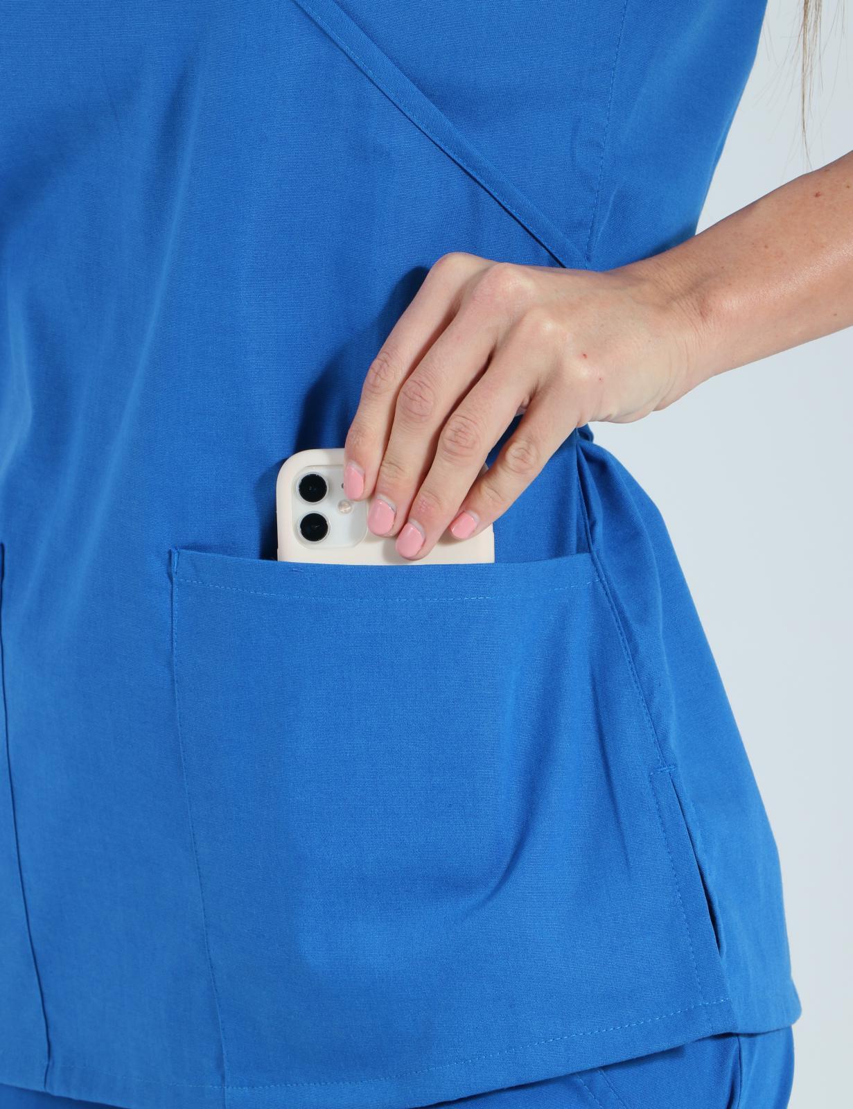 Daring in design, yet practical and durable, the perfect intersection between style and practicality, arguably makes mock-wraps the most flattering tops on the scrub market. Made from the perfect blend of cotton, polyester, and spandex, and interwoven with an antimicrobial finish, that protects against bacteria, mildew, and other hazardous microbes, this 'Mock-wrap' scrub top features two large front pockets and an internal pager pocket providing you with ample storage space.