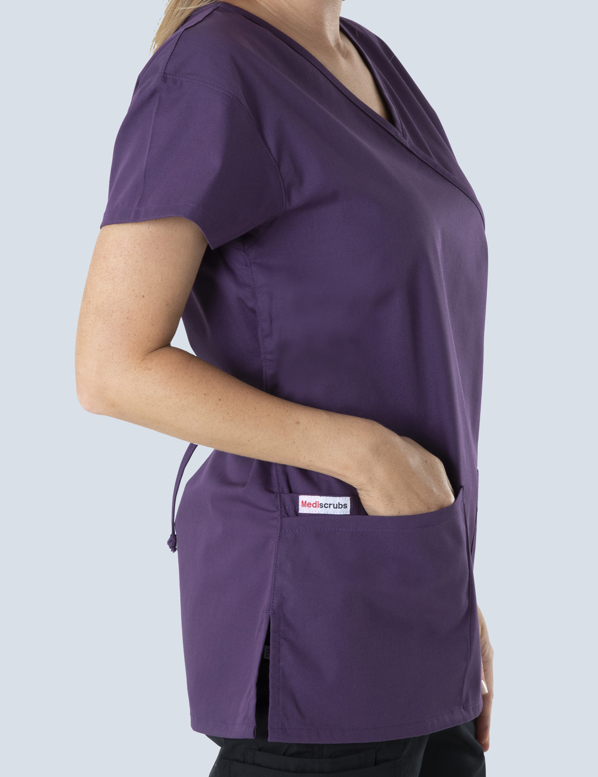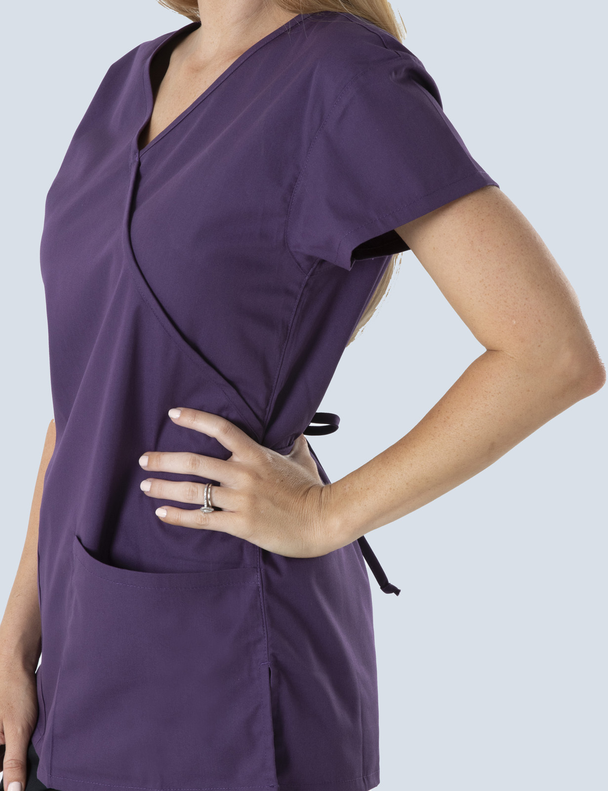 I now have 8 of these mock wrap scrub tops. They're slightly stretchy so don't restrict movement. Wash & wear well & quick to dry. Soft fabric doesn't allow fur (or slobber) to stick for long. Nice deep pockets & side vents make them really comfy.Ali