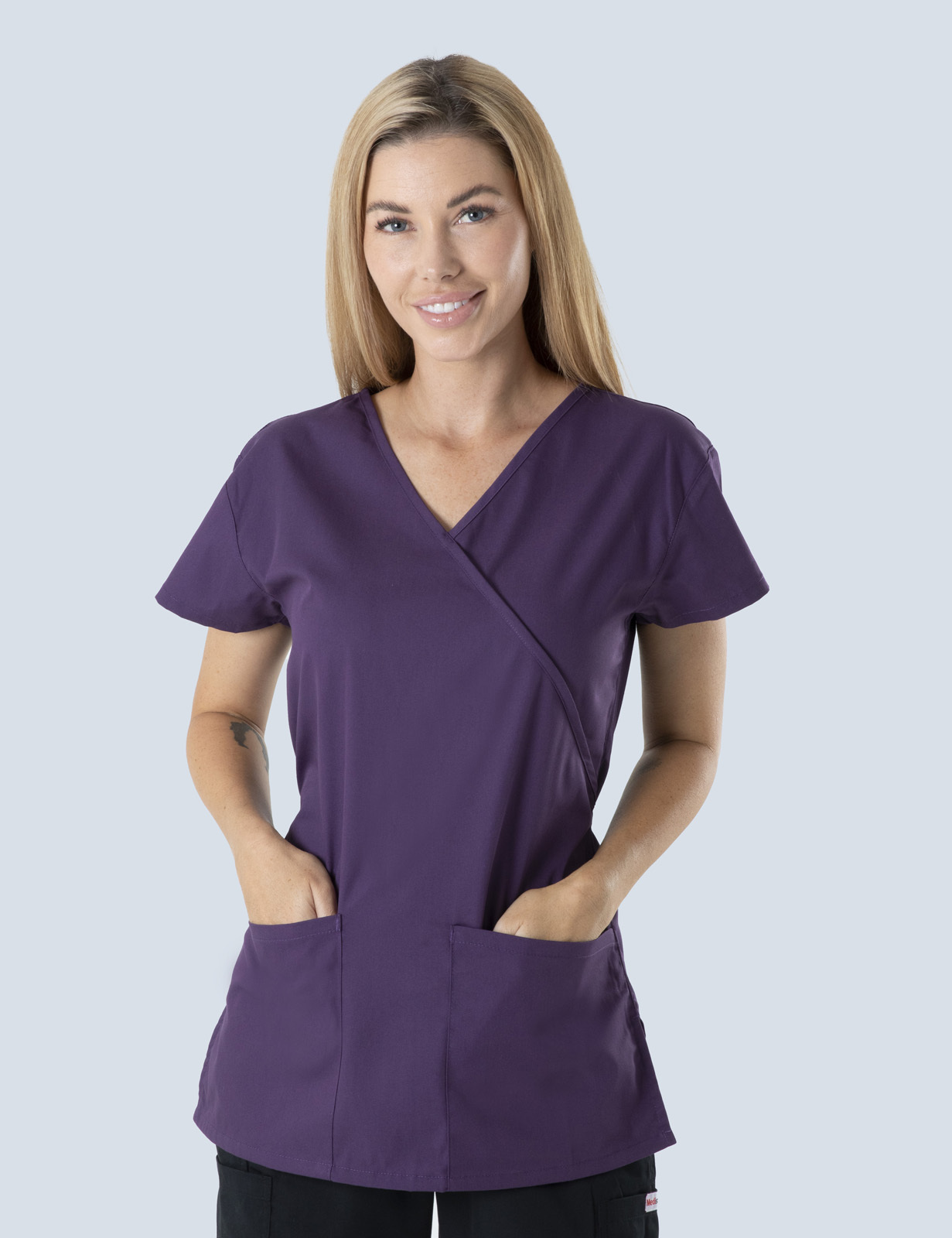 Daring in design, yet practical and durable, the perfect intersection between style and practicality, arguably makes mock-wraps the most flattering tops on the scrub market. Made from the perfect blend of cotton, polyester, and spandex, and interwoven with an antimicrobial finish, that protects against bacteria, mildew, and other hazardous microbes, this 'Mock-wrap' scrub top features two large front pockets and an internal pager pocket providing you with ample storage space.